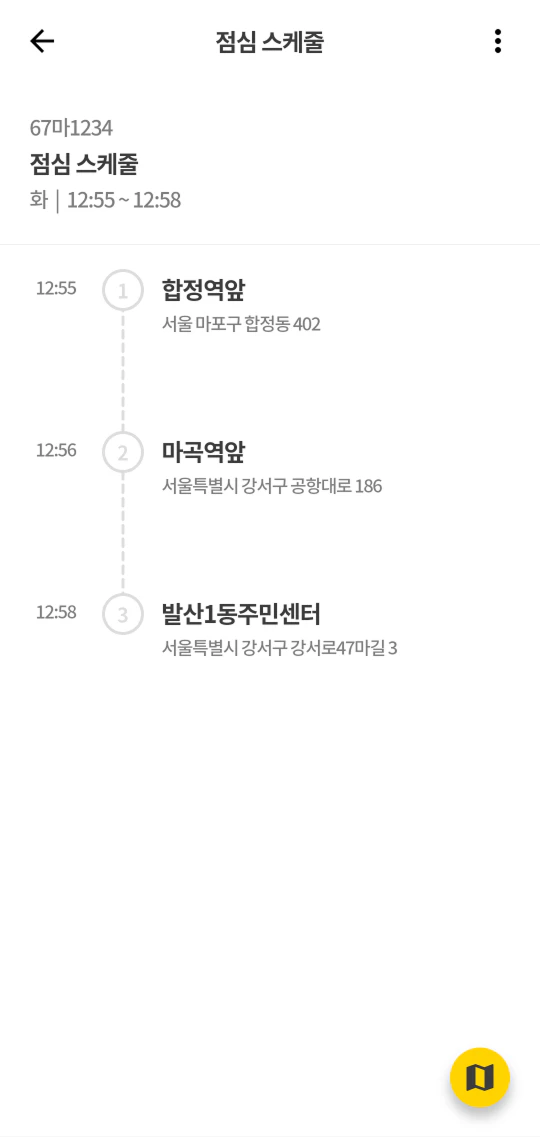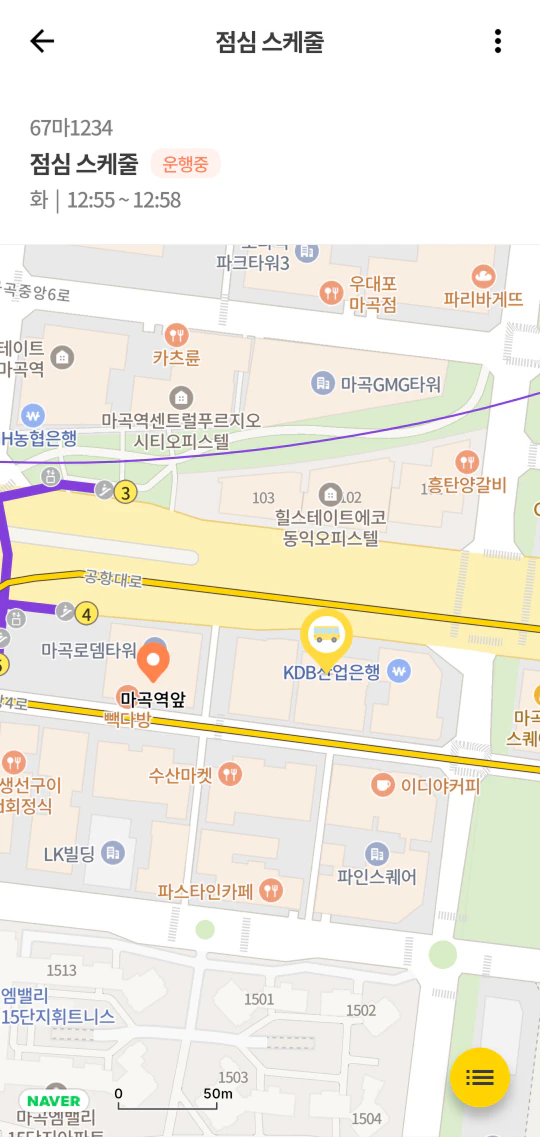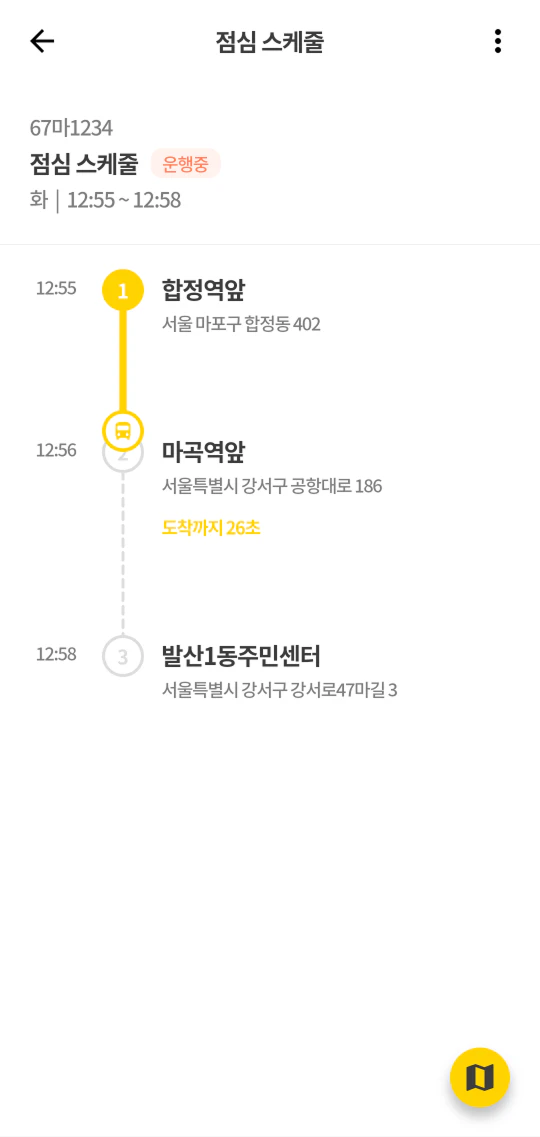 - 스케줄 정보(이름, 차량번호, 운행 요일)와 탑승지 목록이 표시됩니다.